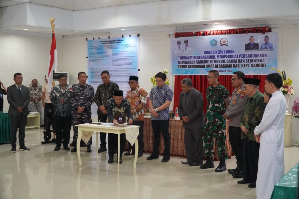 Dialog ini dilaksanakan di ruang Serbaguna Rumah Jabatan Bupati dan dihadiri oleh FORKOPIMDA Kabupaten Kepulauan Sangihe, Para Pimpinan dan Tokoh Lintas Agama yang ada di Kabupaten Kepulauan Sangihe.