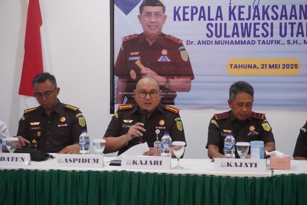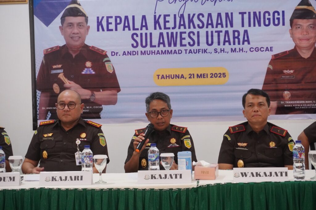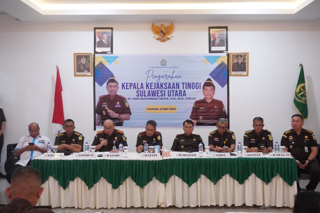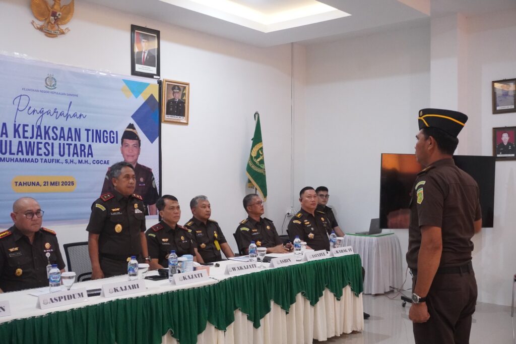 Tahuna- Kepala Kejaksaan Negeri Kepulauan Sangihe Dr. Hendra A. Ginting, S.H., M.H., beserta Kasubag dan para Kasi dan seluruh pegawai Kejaksaan Negeri Kepulauan Sangihe mengikuti Pengarahan Kepala Kejaksaan Tinggi Sulawesi Utara Dr. Andi Muhammad Taufik, S.H., M.H., CGCAE. (Rabu, 21/05/2025)